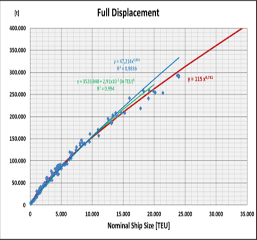 From the available container ship data an almost linear equation of high regression quality for the relation between container capacity and displacement (scantling) can be derived, i.e., the exponent of the exponential equation has a value of almost ‘1’ (Figure 4). The high quality of the almost linear regression equation is again based on numerous smaller ships. For ULCS it provides apparently too high values (for projected ships of CC > 24,000 TEU no corresponding values for Δ are anyhow available yet). For ships of CC < 20,000 TEUAbramowski et al. (2018) have found a logarithmic regression equation (R2 = 0.994) whereas with only 7 ships of CC > 14,000 TEU the related data base was rather poor: